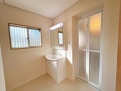 【リフォーム前】洗面化粧台は新品に交換します。天井・壁はクロス張替えを行い、床はクッションフロアを張り替えます。