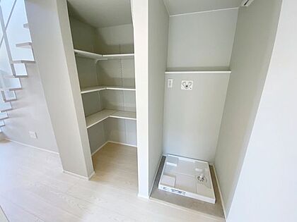 室内(2025年9月)撮影◎本日案内可能◎洗濯機置場横には収納スペース付き◎洗濯後すぐに衣類をしまえて家事の時短になりそうですね♪