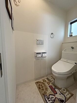 【トイレ】温水洗浄便座付きのため、毎日快適にご利用いただけます。収納棚があり、トイレットペーパーのストックや掃除用品などを仕舞うことができます。