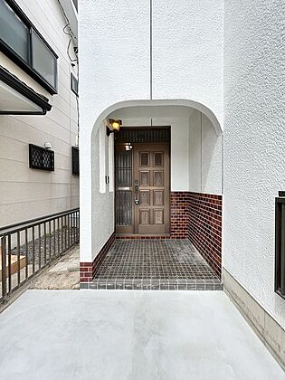 アプローチからの玄関がおしゃれな住宅。出発も帰宅も楽しみになるかも。
