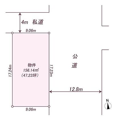| 土地面積/坪(坪単価) | 156.14m2(登記簿)/47.32坪(54.90万円) | 代表的な接道 | 角地 私道 (位置指定) 北 4m、東 12.8m ※詳細は備考欄をご確認ください |