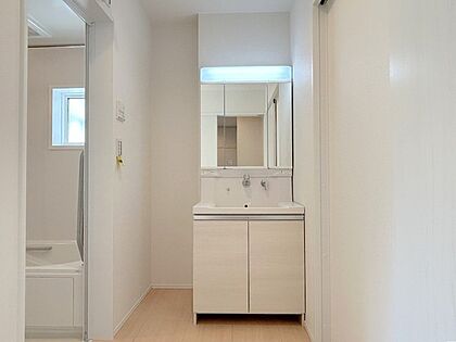 収納豊富な三面鏡付洗面化粧台。水回りのあれこれがキレイに収まりそうですね。