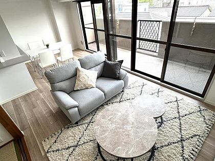 •  ダイニング側から見たLDKです。ダイニングテーブルもソファーも置いていただける広さです。