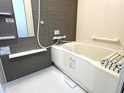 •  浴室です。浴室も新品交換いたしました。一面だけ色の異なるおしゃれな浴室で日々の疲れを取りませんか。