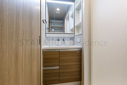 三面鏡は観音開きの収納となっており、細々とした洗面用品も片付きます