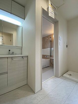 収納豊富な洗面台。備品をすっきりさせることで生活感が出にくくなります。洗濯機スペースもしっかり確保されています。