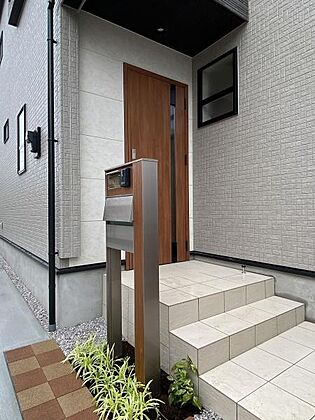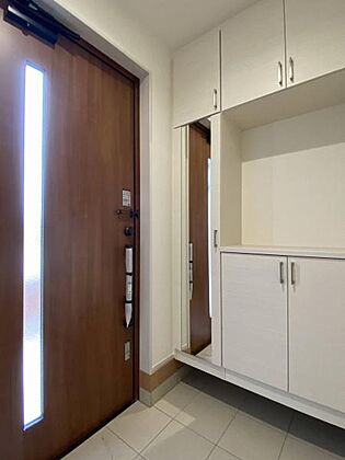 たっぷり収納できるシューズボックスを備えた玄関内。姿見付きでおでかけ前の身だしなみチェックができ便利です。