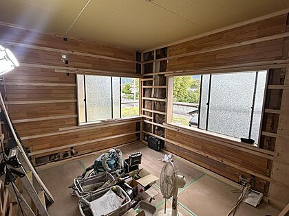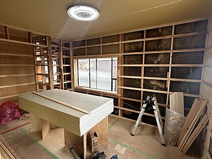 【リフォーム中】2階居室です。床はフロア張替え、壁天井は石膏ボード施工、クロス張りにしていきます。