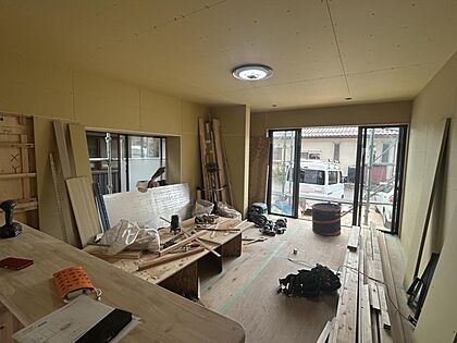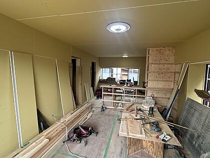 【リフォーム中】約16帖の対面キッチンのリビングにリフォームをします。南側に掃き出し窓の新設、床はフロア張替え、壁天井は石膏ボード施工からのクロス張りにしていきます。耐震補強工事も同時に行います。