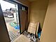 【リフォーム中】玄関扉は開き戸タイプの新品に交換します。玄関内部はタイル張り、シューズボックスの取り付けを行います。