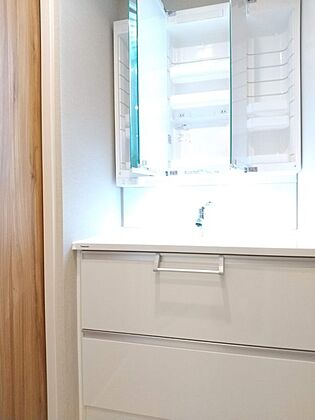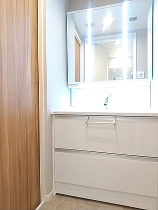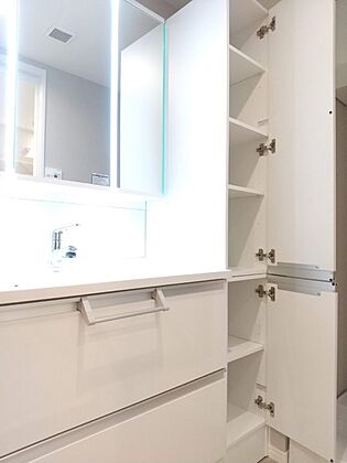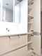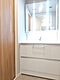 白を基調とした清潔感のあるパウダールームです。収納が付いているので小物の収納に困りません。