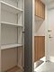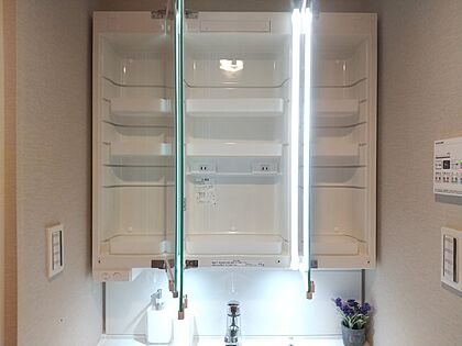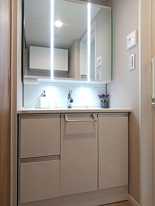 白を基調とした清潔感のあるパウダールームです。収納が付いているので小物の収納に困りません。