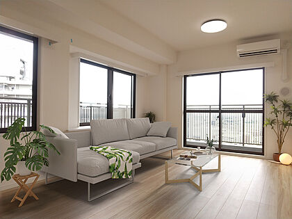 リビングのバーチャルホームステージングです。明るく清潔感のあるイメージに仕上がりました。