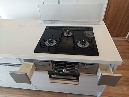 作業スペースも広々のお料理もしやすいキッチンです。三口コンロでお料理もはかどります!