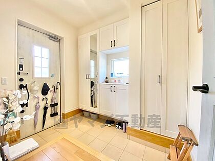 採光も考えられた明るい玄関です。たっぷり収納できるシューズボックス付きなので、家族全員の靴がきれいに整頓できます。鏡付きで外出時の身だしなみチェックに便利です^^すぐ横に収納スペースもあり^^