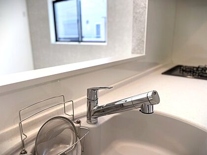 見た目にもスマートな浄水器一体型。水栓は、引出し式のシャワーヘッドなのでシンクの隅々までお掃除できます♪