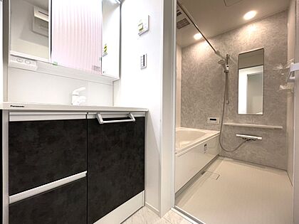 3面鏡、シャワーヘッド、収納を配置した洗面スペースです。朝の身支度に便利です。