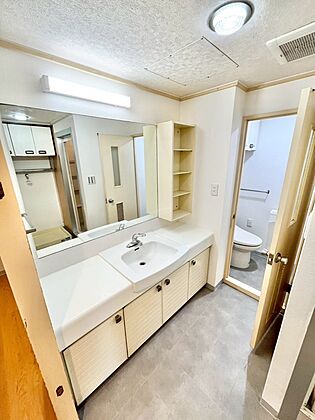 大きな一面鏡が特徴的な洗面化粧台です。鏡の隣りに収納棚がございます。