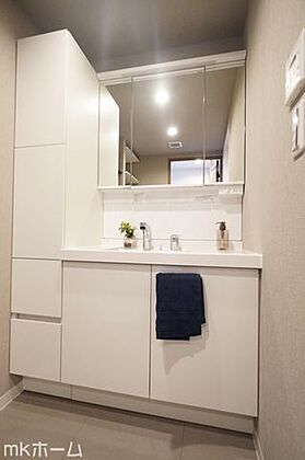 大きな鏡と洗面台が付いた洗面化粧台は収納も豊富!買い置きした日用品などまとめて収納する事が出来ます!