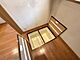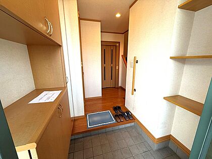 収納豊富な玄関。シューズボックスの他に、物入・納戸(約1.6帖)も有り、1階部分に収納スペースが集まっています。