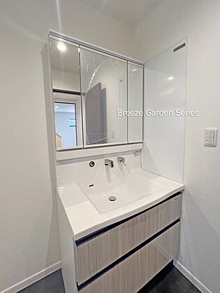 内装:建物プラン例:鏡の裏側など収納が充実した洗面台