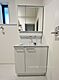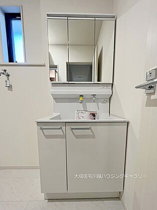 内装:4号棟:お手入れがしやすく、収納力の高い三面鏡洗面化粧台です。 現地写真2024.11.3撮影