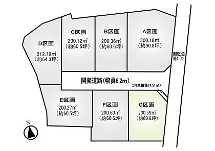 区画図:G区画:敷地ゆとりの約60.6坪!開放感のある人気の角地です。
