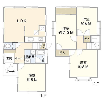 1F:LDK/洋室約8帖/洗面/浴室/トイレ2F:洋室約8帖/洋室約7.5帖/洋室約6帖