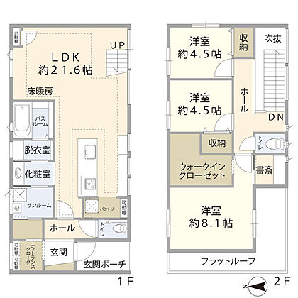 1階:LDK約21.6帖/SC/サンルーム2階:洋室約8.1帖/洋室約4.5帖×2/WIC/書斎