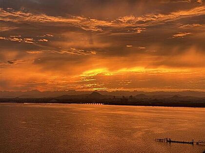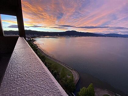 美しい真っ赤な夕焼けの空と琵琶湖の景色です。自然を身近に感じながらお過ごしいただける住戸です。【住戸からの眺望】