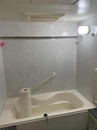※販売対象に家具・調度品は含まれません。追い焚き機能付きの浴室。立ち上がりをサポートする手すりが設けられています。