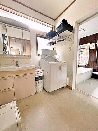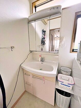 三面鏡の裏側には収納棚を確保。スキンケア用品やヘアケア用品などをすっきり整理できます。
