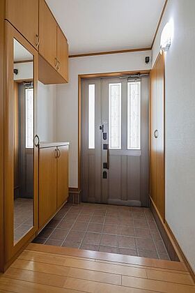 天井までの高さがあるたっぷり玄関収納は全身鏡付きなのも便利なポイント。カウンタータイプなので、お気に入りの絵や、ご家族の思い出のお写真などを飾るのもおすすめです。