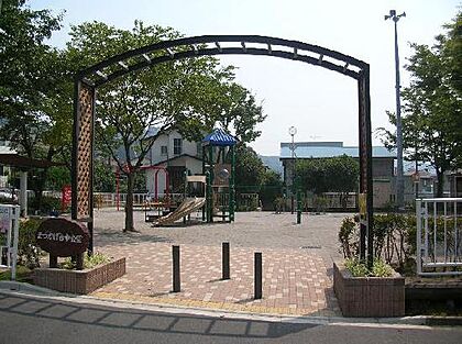 【まつかげ台中公園】110m 公園の入り口にはアーチがあり、どこかワクワクできる公園です。いつもとはちょっと違う滑り台に子どもは大はしゃぎです。