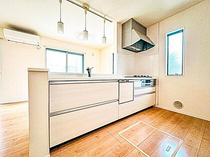【リビングを見渡せる開放感のある対面式キッチン】