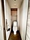 ウォシュレット機能付きのトイレ。収納もあり実用性も兼ね備えた造り。