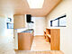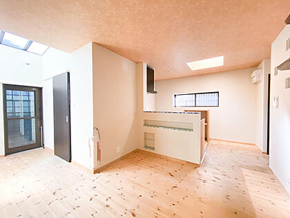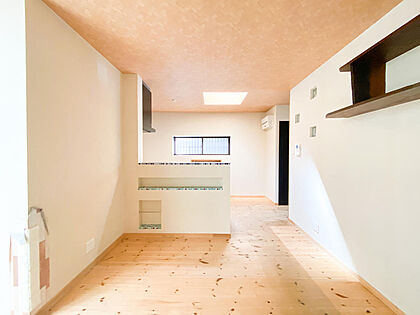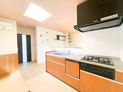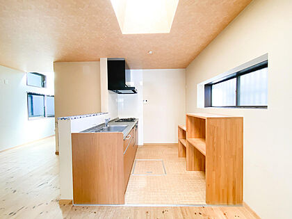 対面式キッチン。背面に収納棚も設置されております。作業スペースも十分幅がございます。壁面には窓もあり、換気にも便利。天井にはトップライトが設置されていることで、明るさや開放感を感じられます!