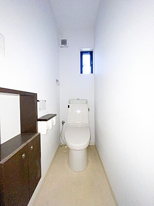 トイレ。平成24年12月に入替されております。収納棚もあり、掃除道具等の収納に便利です。