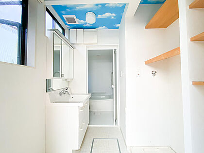 洗面所。洗濯機も置いて頂けます。備付の棚板がございますので、リネン類の収納に便利です。洗面台は、平成24年12月に入替されております。