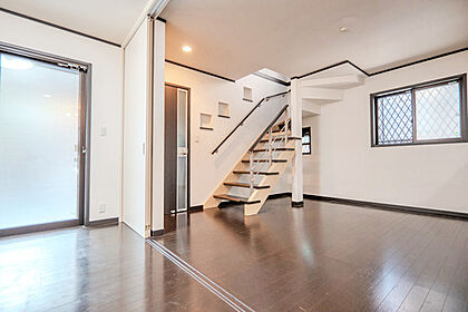 階段はシンプルで機能的、洋室は白壁とダークフローリングで落ち着いた雰囲気です。