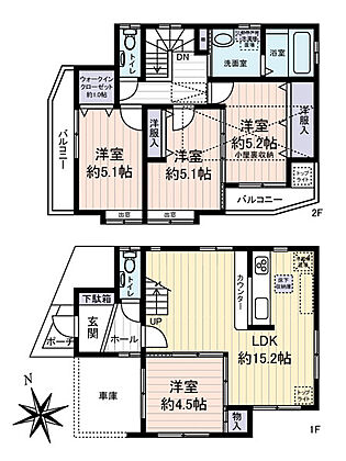 1階はLDKと洋室、車庫付き。2階は洋室3部屋と水回り、収納も充実しています。