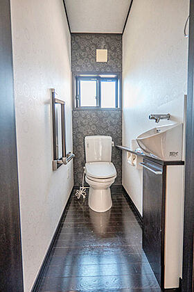 2階トイレは窓付きで明るく、手すりもあり安心設計です。