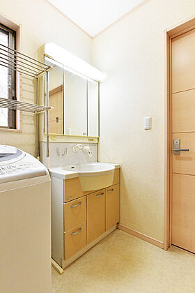 朝の身支度や入浴後のひとときを過ごす洗面室は収納豊富で水栓周りがスッキリと片付きます。
