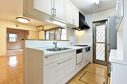 キッチンは食器洗乾燥機付。対面式キッチンでご家族とコミュニケーションをとりながら料理が楽しめます