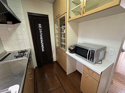 システムキッチンの後ろに備え付けのカップボードを完備 十分な収納量でそのままお使いいただけます