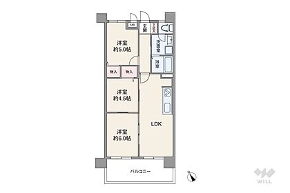 LDKは縦長リビングのプラン。洋室2部屋と隣接しており、つなげて広く使うことも可能です。バルコニーに面しているので、採光・通風良好。