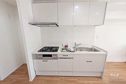 キッチンです。2025年7月にリフォーム済み。食器洗浄機や魚焼きグリル、3口コンロなどの便利な設備が充実しています。壁付けキッチンでLDKのスペースを広く使えます。