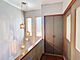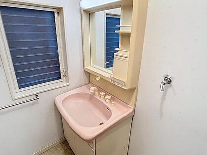 ピンク色のアクセントの入った優しいお色味の洗面です