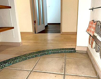 玄関にはこだわりのタイルを施行。ゲストの方にも好評です♪
