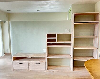 リビングに面したシェルフは見せながら収納できる優れもの。